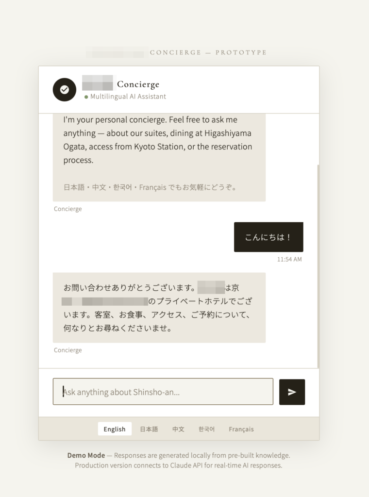 納品したデモHTMLは英語・日本語・中国語・韓国語・フランス語の5言語に対応。客室・食事・アクセス・予約方法の応答ナレッジを組み込み、旅館のブランドトーンに合わせた落ち着いたUIデザインにしました。